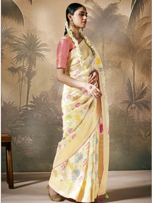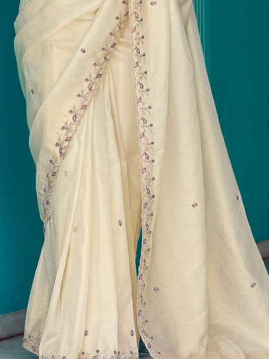 Dhiyona KM Women Cream Tissue Silk Saree With Sequins Work & Purple Contrast Blouse