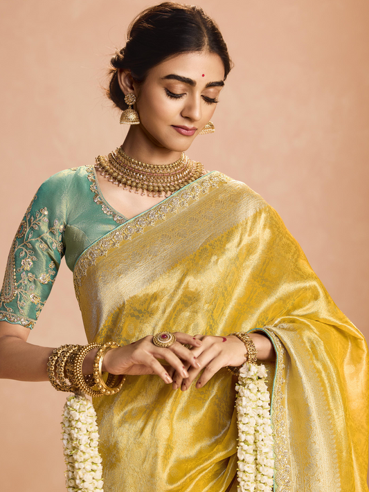Dhiyona KM Women Yellow Kanjivaram Silk Saree With Sea Green Embroidered Blouse