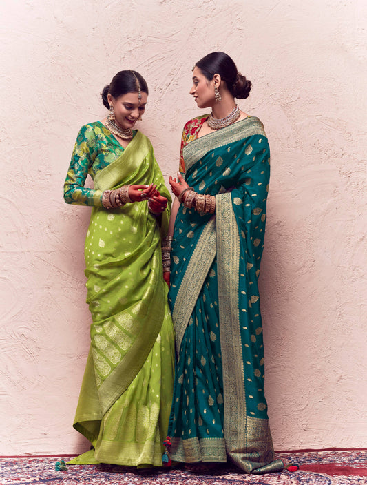 Dhiyona KM Women Elegant Sea Green Banarasi Silk Saree With Floral Weaving, Sequin, Opal & Parrot Motifs