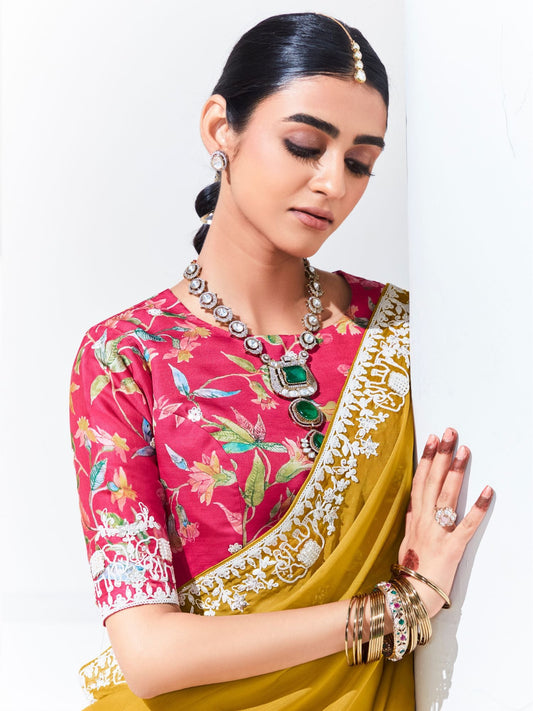 Dhiyona KM Women Yellow Saree With Floral-Print Blouse “ Radiant Elegance