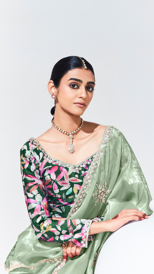 Dhiyona KM Women See Green Designer Organza Saree “ A Blush Of Elegance