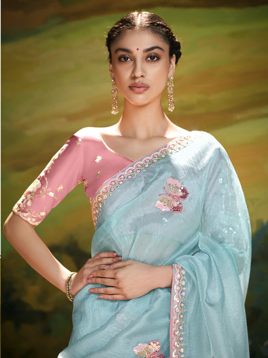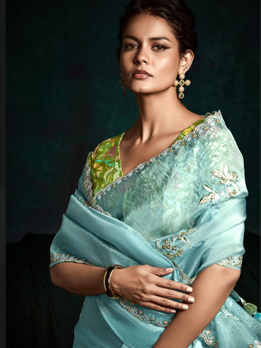 Dhiyona KM Women Ice Blue Designer Organza Saree- A Vision Of Tranquil Beauty
