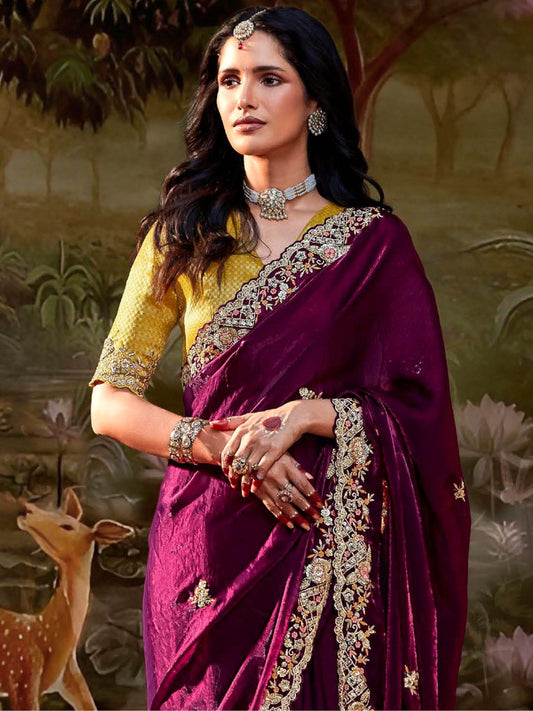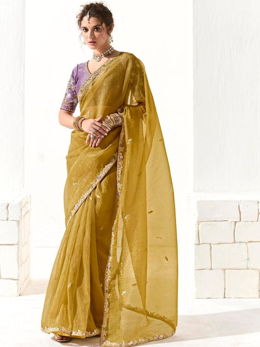 Dhiyona KM Women Mustard Tissue Silk Saree With Sequin Embellishments & Purple Embroidered Blouse