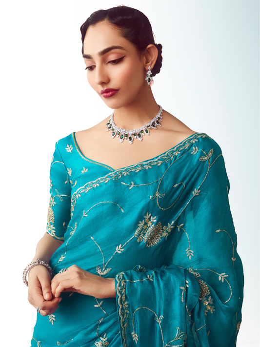 Dhiyona KM Women Teal Blue Banarasi Zari Tissue Saree “ A Dreamy Drape By Kimora