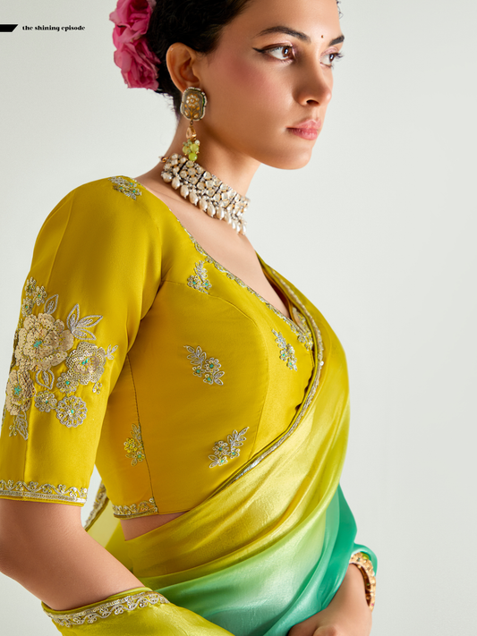 Dhiyona KM Women Sea Green Dola Silk Saree With Yellow Golden Embroidered Blouse