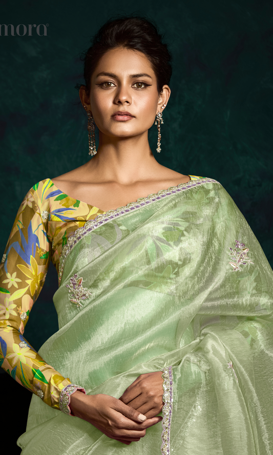 Dhiyona KM Women Elegant Sea Green Pure Tissue Silk Saree With Floral Embroidery