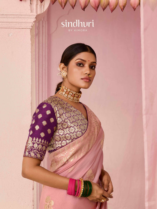 Dhiyona KM Women Light Pink Silk Saree With Golden Sequin Work