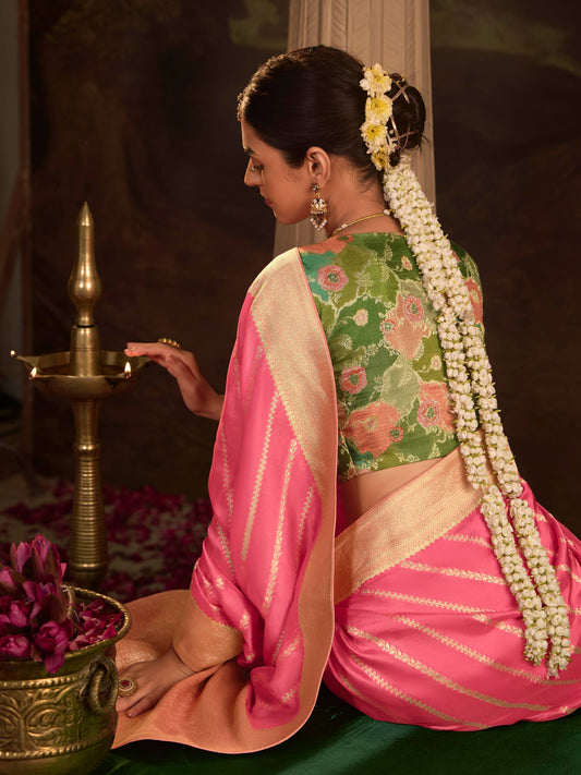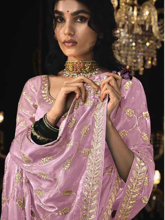Dhiyona KM Women Pink Tissue Embroidered Fancy Heavy Border Saree