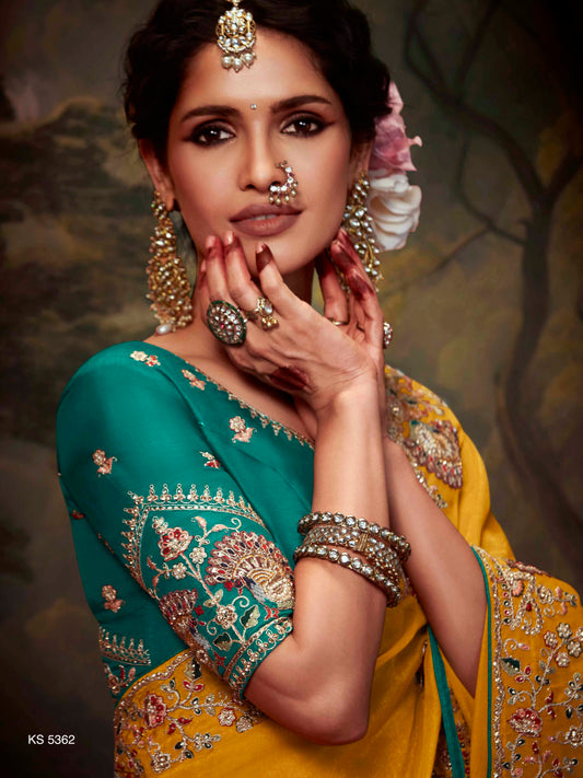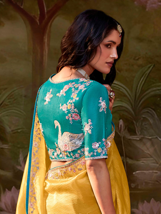 Dhiyona KM Women Yellow Silk Embroidered Butta Saree With Teal Blouse