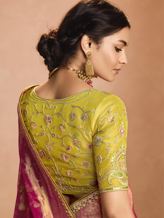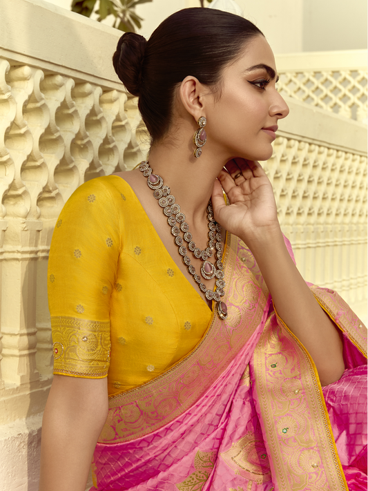 Dhiyona KM Women Pink Silk Saree With Contrast Yellow Blouse