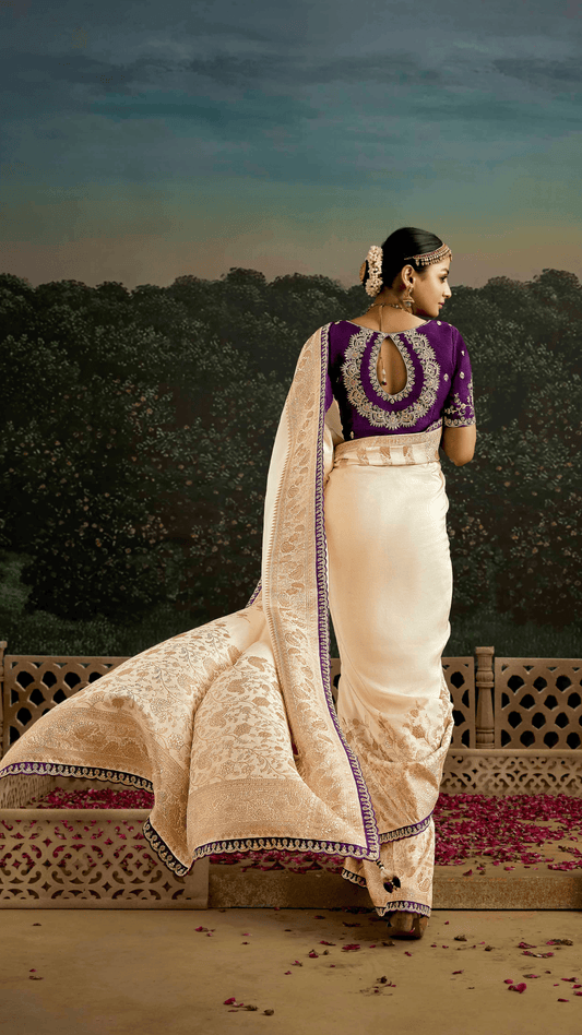 Dhiyona KM Women Off-White Banarasi Dola Silk Saree With Golden Zari Work