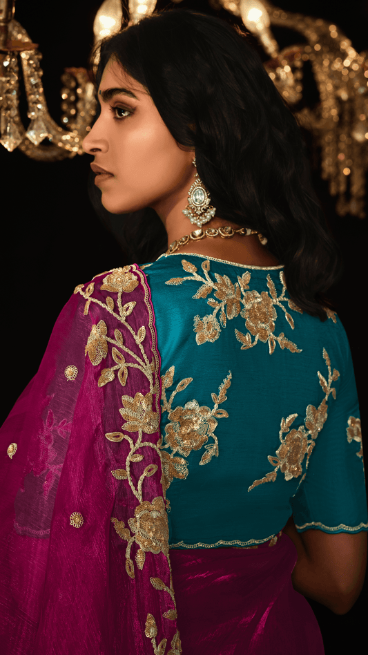 Dhiyona KM Women Red Hand-Embroidered Saree With Teal Blouse