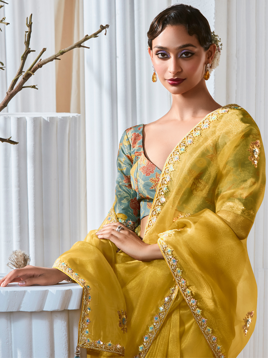 Dhiyona KM Women Yellow Designer Organza Saree: Effortless Elegance For Every Occasion
