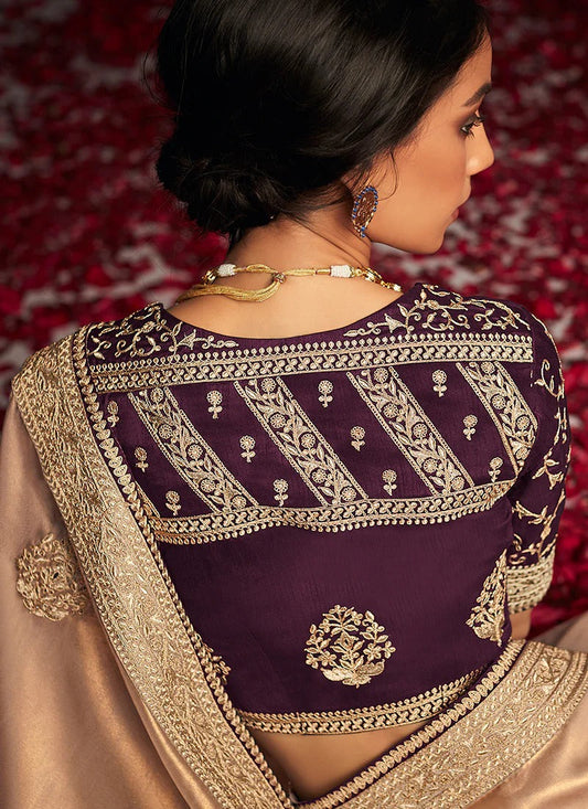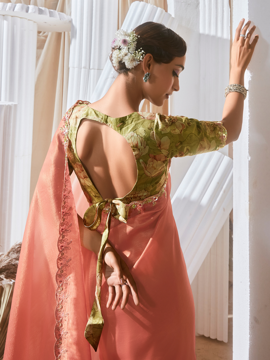 Dhiyona KM Women Trendy Peach Pure Tissue Silk Saree With Designer Printed Blouse