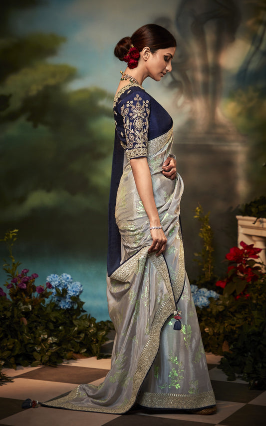 Dhiyona KM Women Pastel Grey Silk Saree With Floral Zari Work And Royal Blue Embroidered Blouse “ Kimora