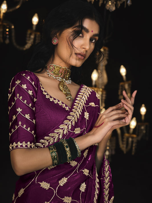 Dhiyona KM Women Regal Dreams In Violet-Wine Silk Saree With Gold Embroidery