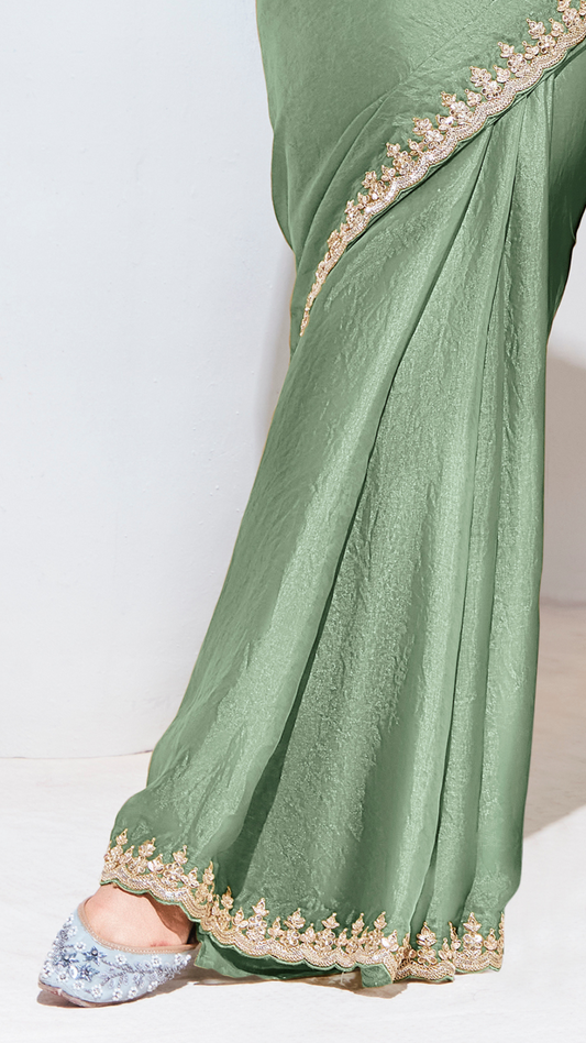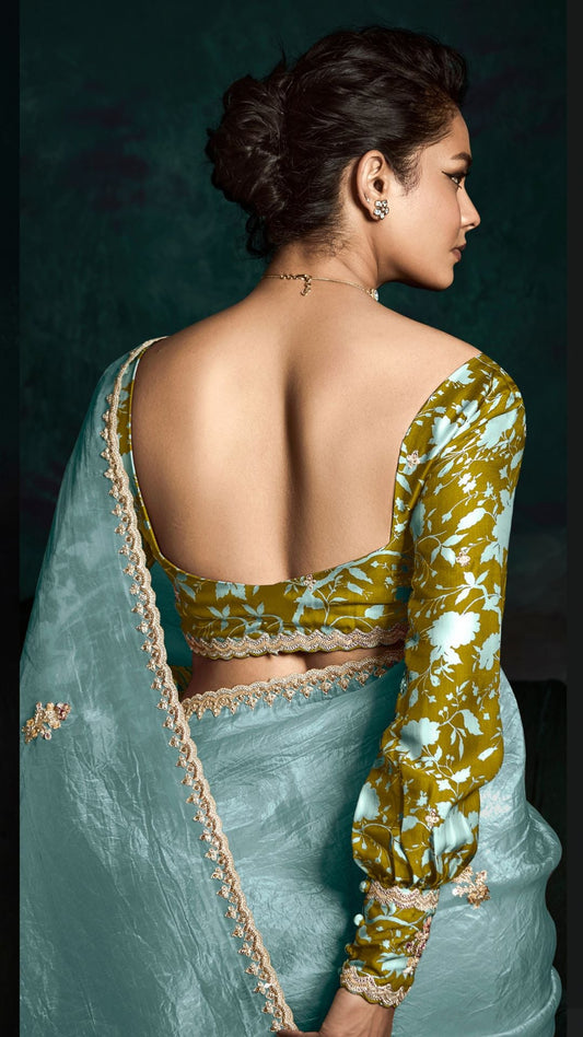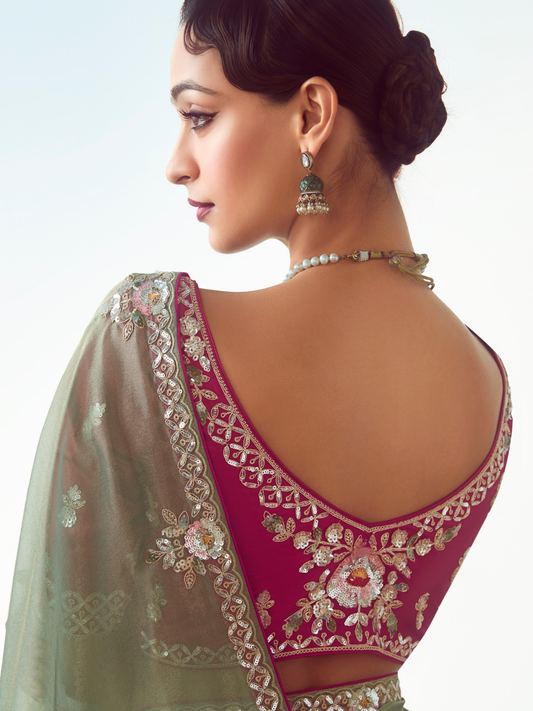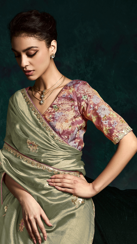 Dhiyona KM Women Sage Green Organza Silk Saree With Unstitched Floral Printed Blouse