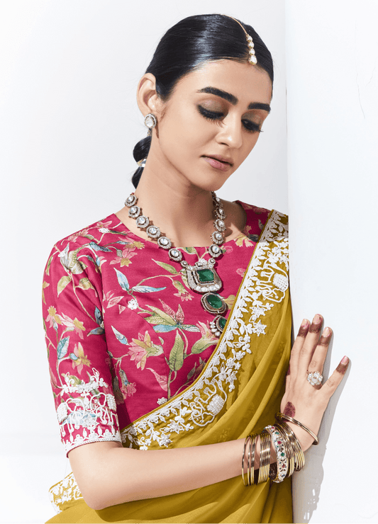 Dhiyona KM Women Mustard Yellow Saree With Floral Blouse “ A Perfect Blend Of Tradition & Style