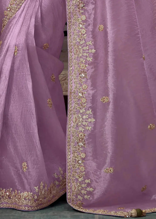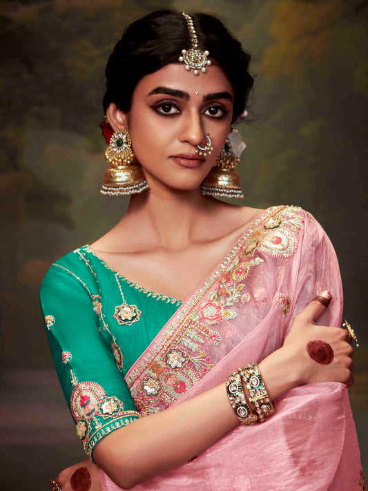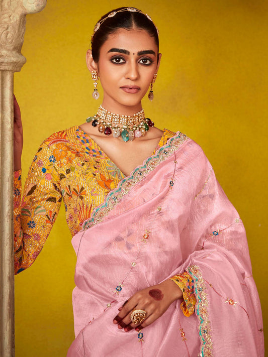 Dhiyona KM Women Elegant Light Pink Organza Saree With Embroidered Border