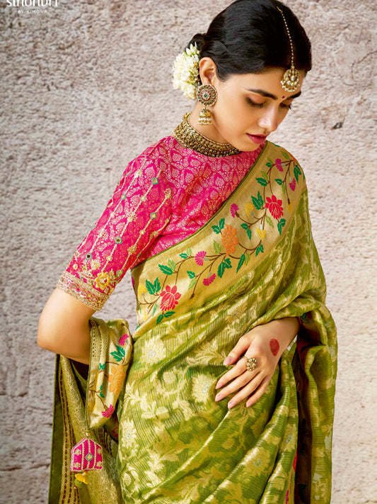 Dhiyona KM Women Olive Green Organza Silk Saree