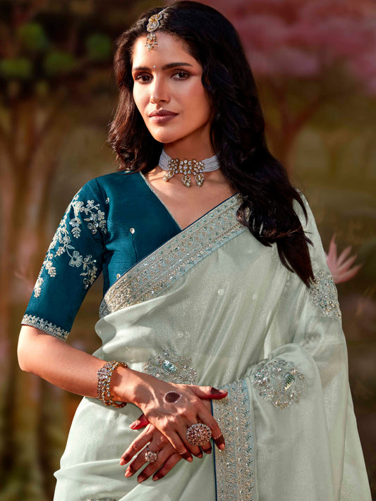 Dhiyona KM Women Sea Green Glass Tissue Organza Saree