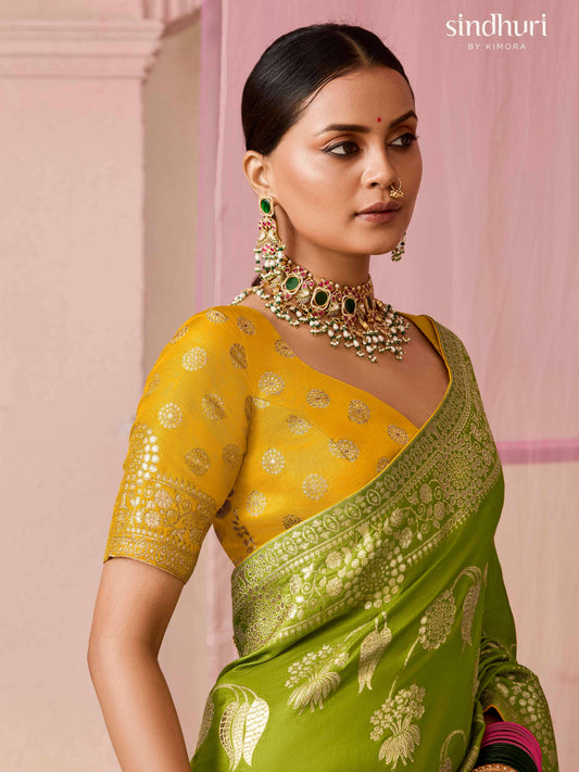 Dhiyona KM Women Mehendi Green Dola Silk Saree With Yellow Golden Embroidered Blouse
