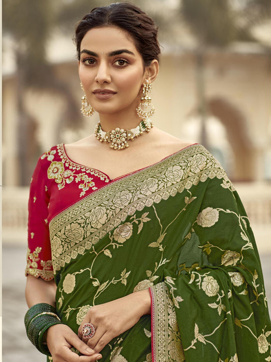 Dhiyona KM Women Green Banarasi Silk Saree With Rich Golden Zari & Red Contrast Blouse