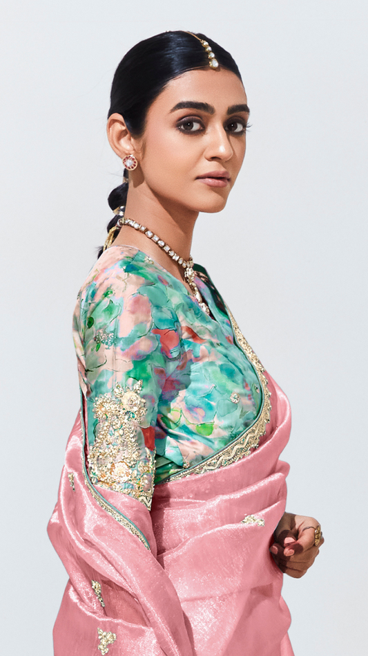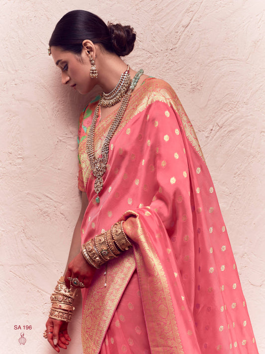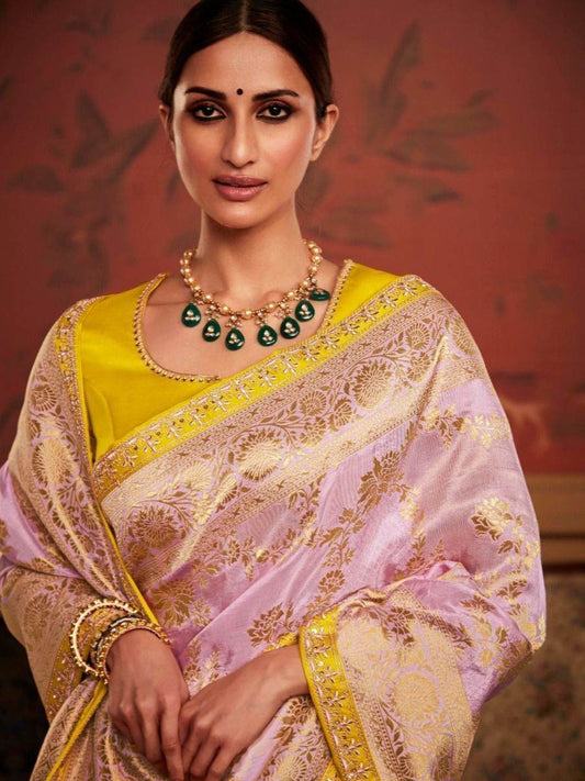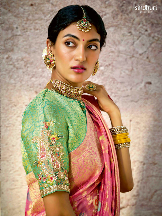 Dhiyona KM Women Pastel Pink Banarasi Silk Saree With Zari Weaving & Contrast Green Embroidered Blouse