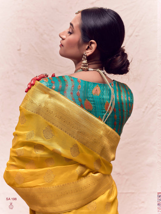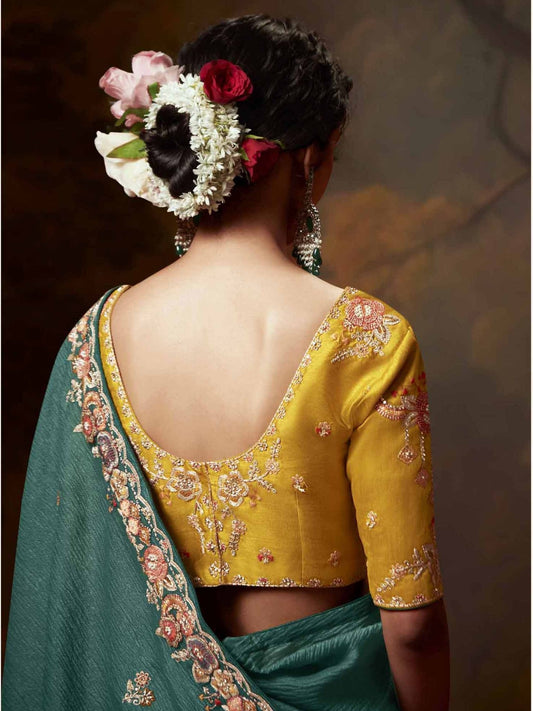 Dhiyona KM Women Teal Green Designer Organza Silk Saree With Yellow Contrast Blouse