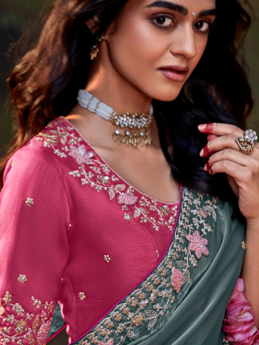 Dhiyona KM Women Teal Embroidered Designer Silk Saree With Pink Blouse
