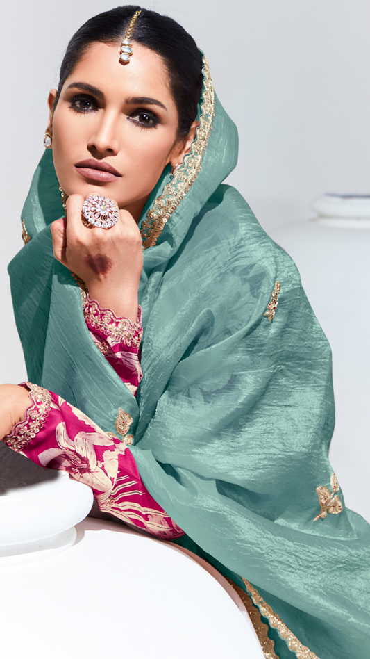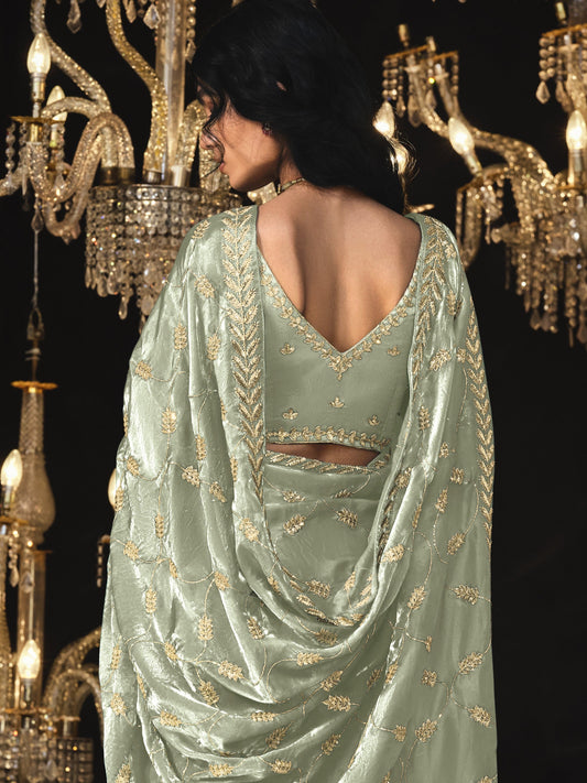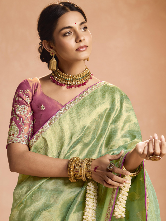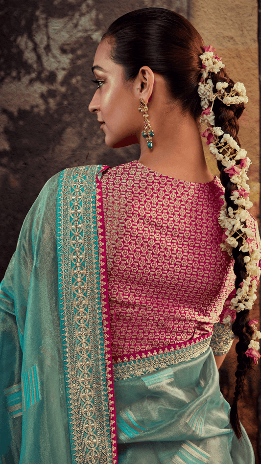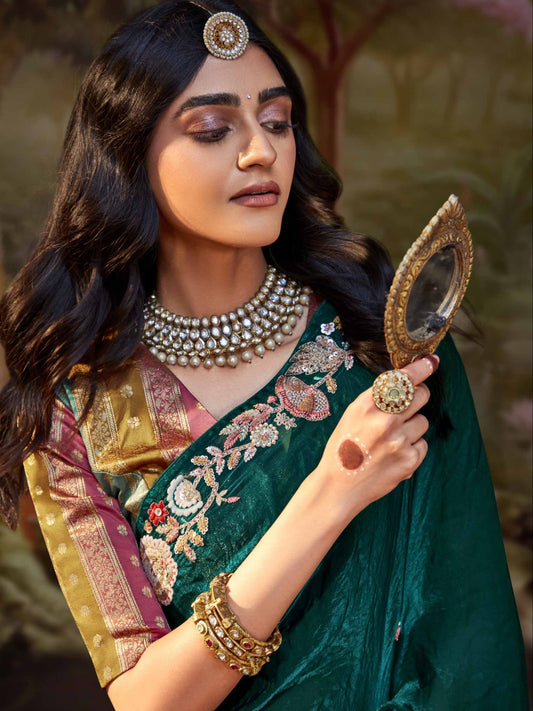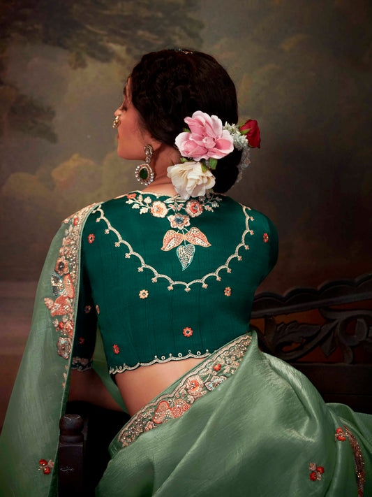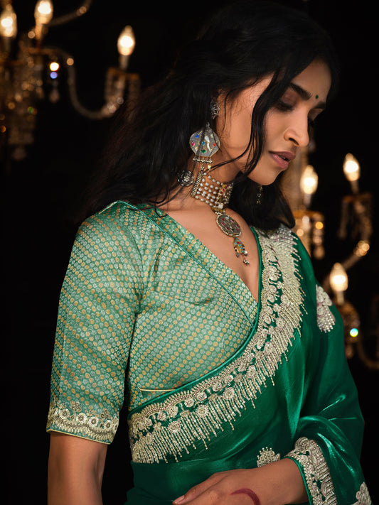 Dhiyona KM Women Regal Sea Green Tissue Silk Saree With Intricately Embroidered Bottle Green Blouse