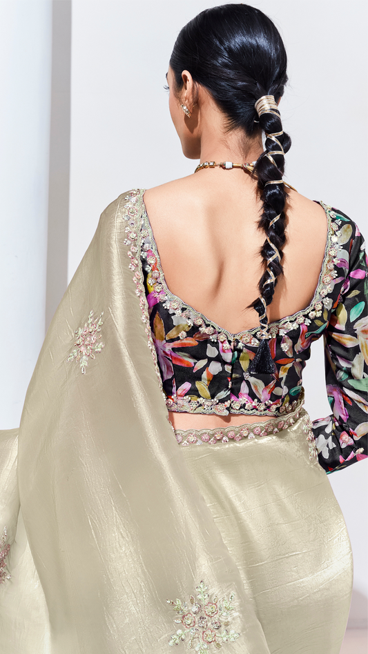 Dhiyona KM Women Beige Pure Tissue Silk Saree With Crushed Texture & Multicolor Floral Print Blouse