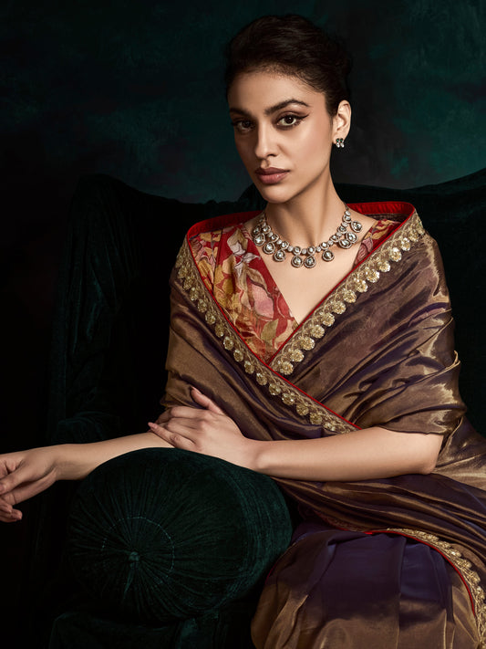 Dhiyona KM Women Elegant Brown Tissue Silk Saree With Crush Effect & Designer Printed Silk Blouseelegant Brown Tissue Silk Saree