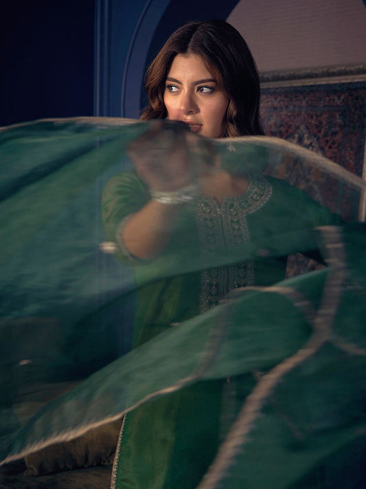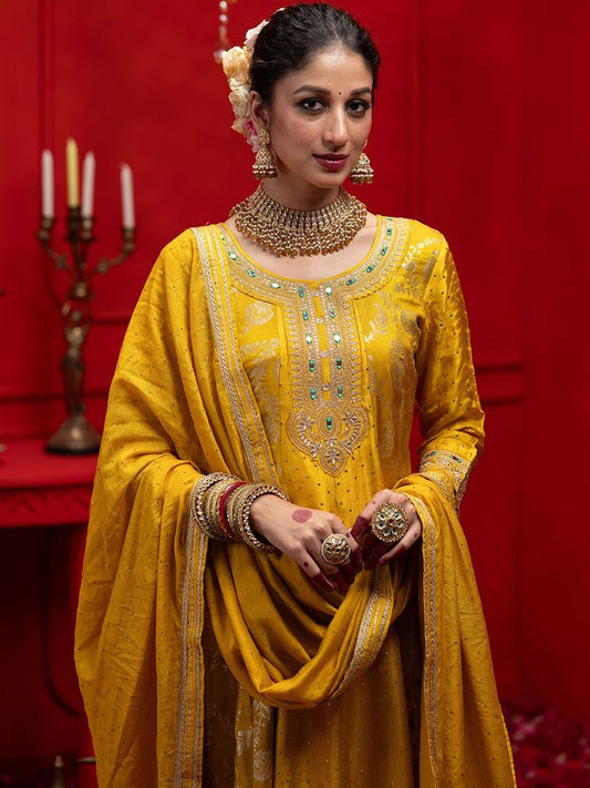 Dhiyona CH Embroidered Round Neck Chinon Sequinned Kurta With Palazzos & Dupatta