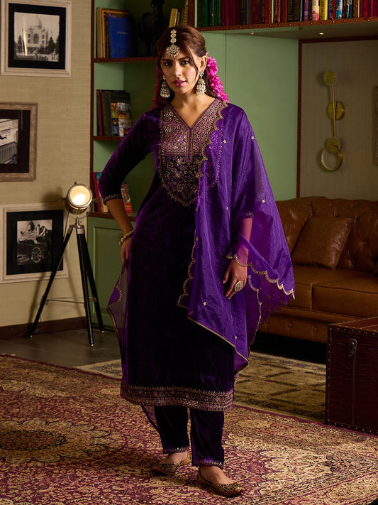 Dhiyona CH Women Ethnic Motifs Embroidered Regular Thread Work Velvet Kurta with Trousers & With Dupatta