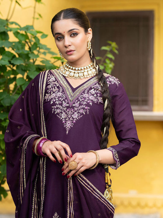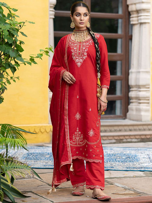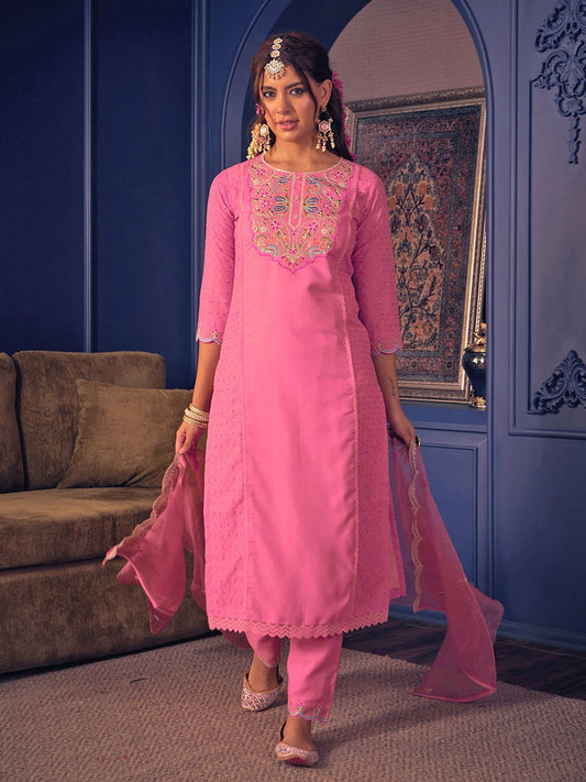Dhiyona CH Embroidered Round Neck Thread Work Straight Kurta With Trousers & Dupatta