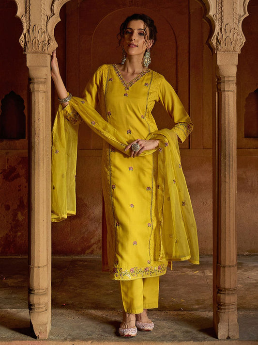Dhiyona CH Floral Embroidered V-Neck Thread Work Straight Kurta With Solid Trousers & Dupatta
