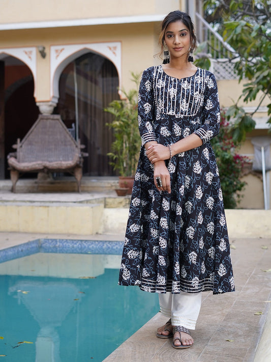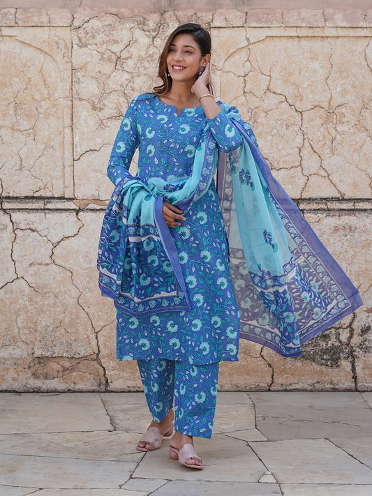 Blue Floral Printed Empire Pure Cotton Anarkali Kurta With Trousers & Dupatta Set