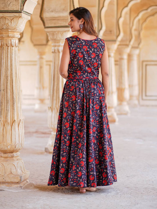 Floral Printed Angrakha Pure Cotton Anarkali Kurta With Trousers & Dupatta
