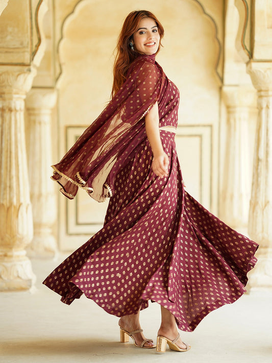 FASHION Floral Printed Empire Pure Cotton Flared Anarkali Kurta With Trousers & Dupatta Set