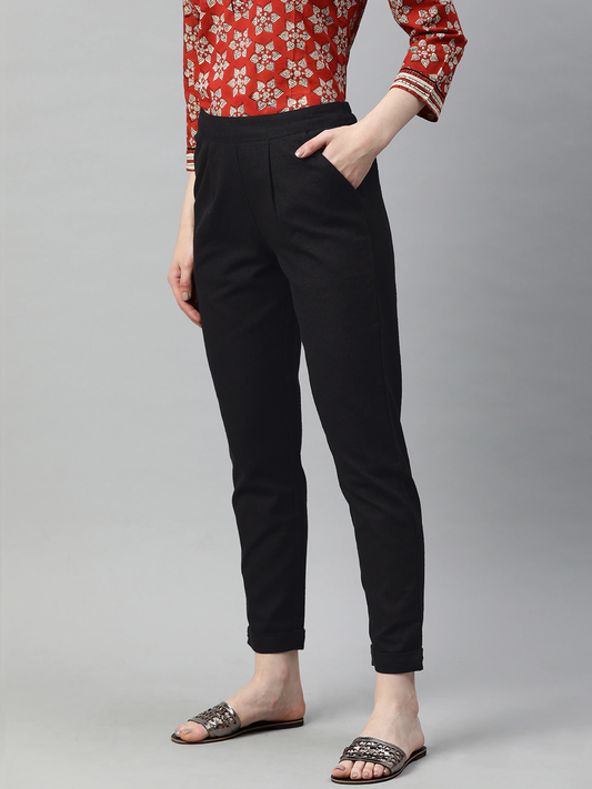 Black Mid Rise Plain Relaxed Cotton Slim Fit Pleated Trousers