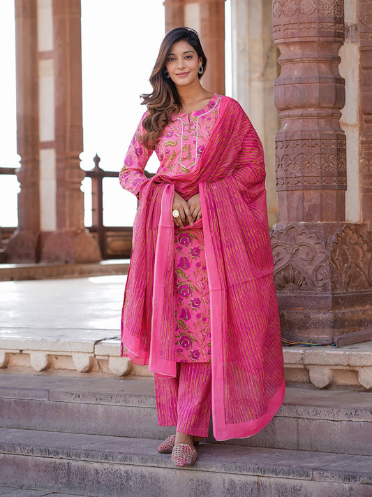 Floral Printed Mirror Work Pure Cotton Straight Kurta With Trousers & Dupatta