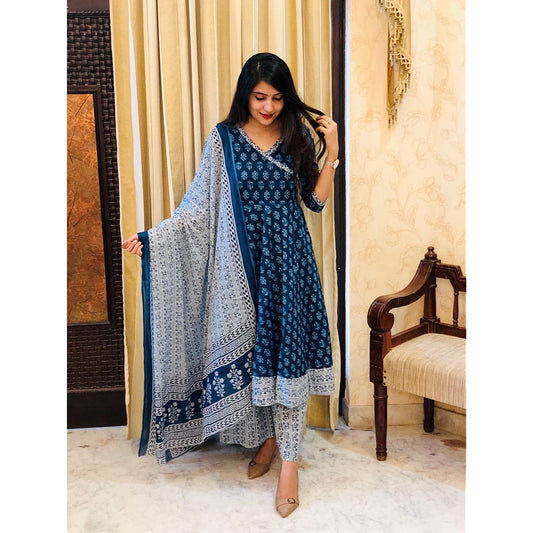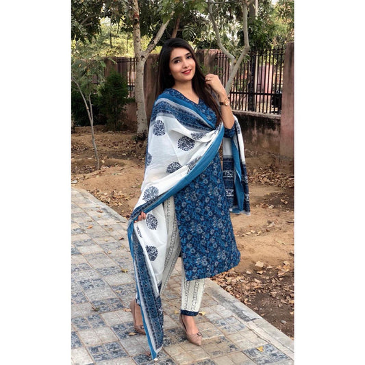 Blue & white Floral Printed Regular Pure Cotton Kurta & Trousers With Dupatta