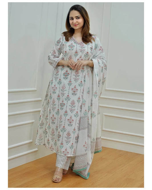 Women's White Cotton Straight Kurta and Pant With Dupatta