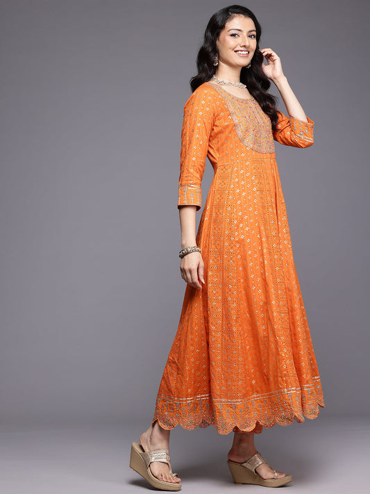 Vendor:Dhiyona VRDhiyona VR Women's Orange Mirror And Thread Embroidered,Zari Embellished Scalloped Schiffli Anarkali Kurta Paired Wirh Printed Bottom And Embroidered Dupatta