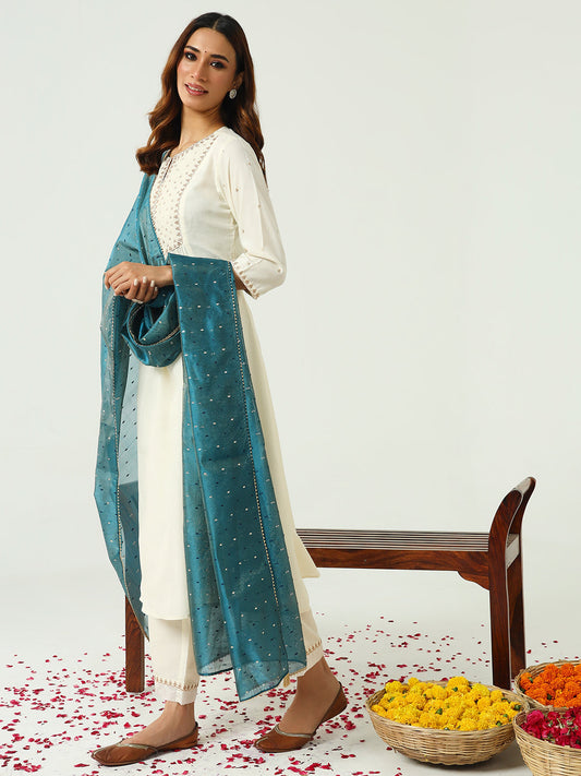 Vendor:Dhiyona FLWomen's Off White Silk Blend Nayra Cut Kurta and Palazzo With Embroidered Dupatta