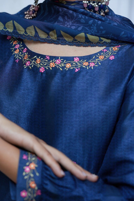 Women Navy Blue Geometric Straight Kurta Pant and Dupatta Set