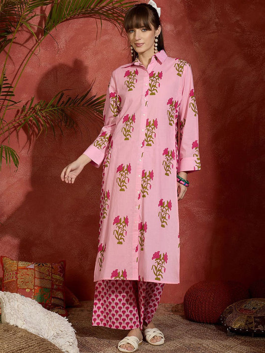 Dhiyona IE Floral Printed Shirt Collar Pure Cotton Straight Kurta With Palazzos