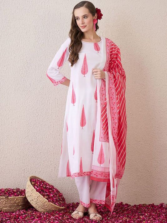 Dhiyona IE Floral Printed Round Neck Pure Cotton Straight Kurta With Trousers & Dupatta