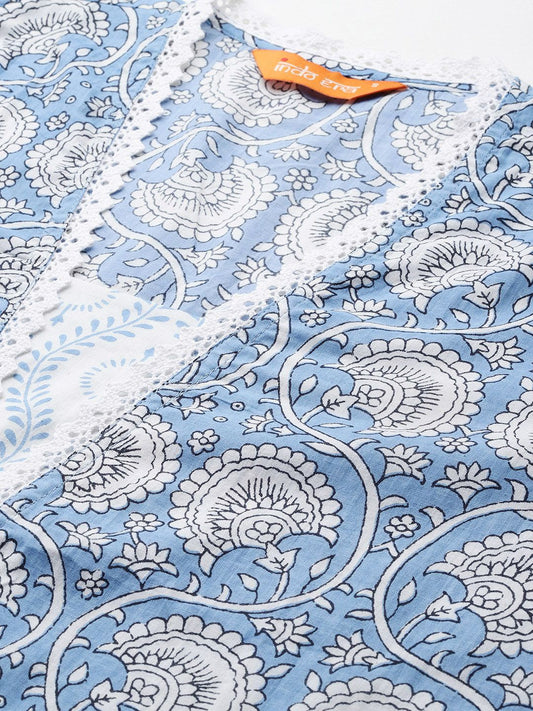 Dhiyona IE Floral Printed Notch Neck Pure Cotton Straight Kurta With Trousers